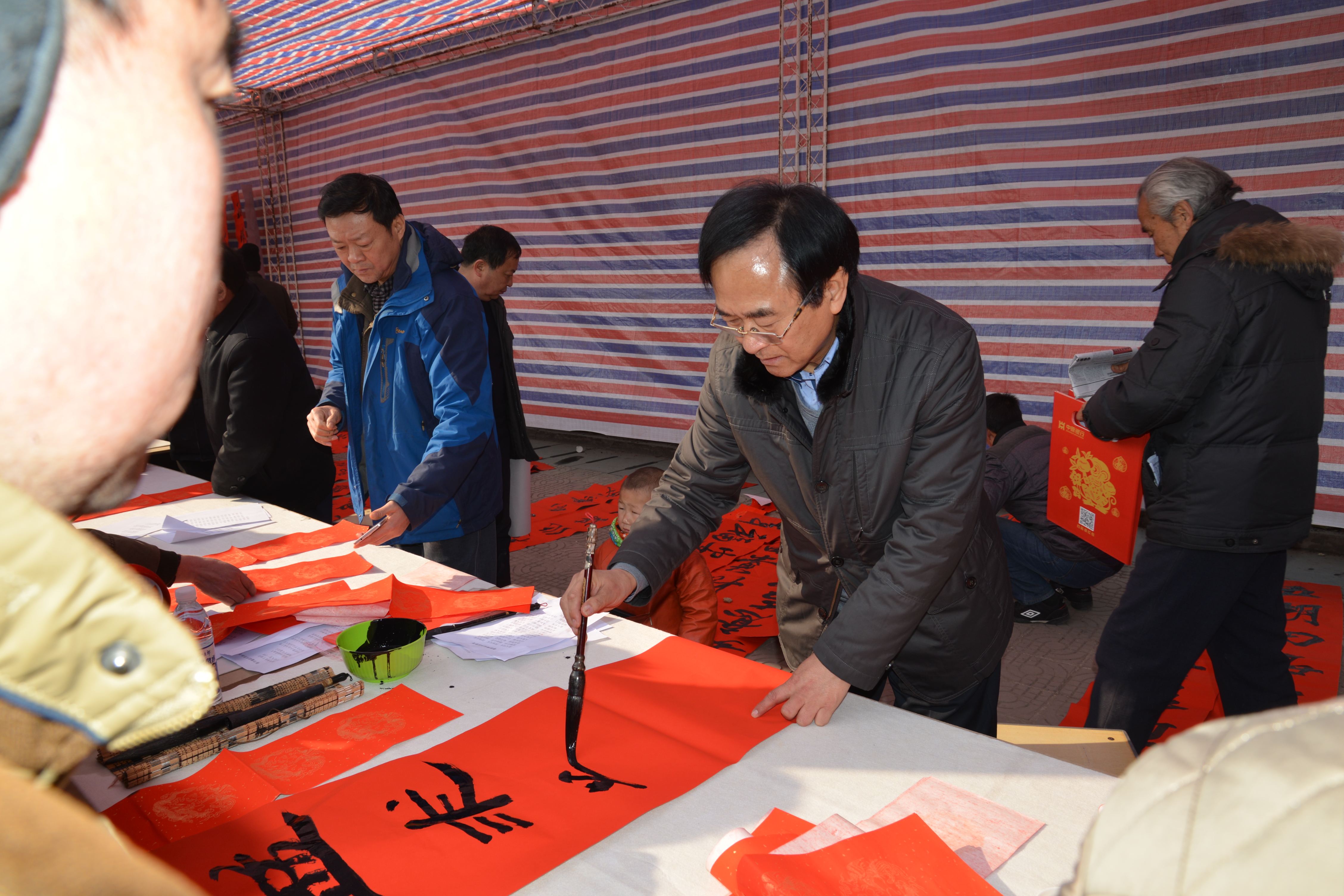 隨后,二十多名省內著名書法家揮毫潑墨,應邀為村民書寫春聯(lián),受到村民的歡迎,魯莊鎮(zhèn)村民陳大爺說,“這寫的真不錯,比買的好,得好好收藏著?!?